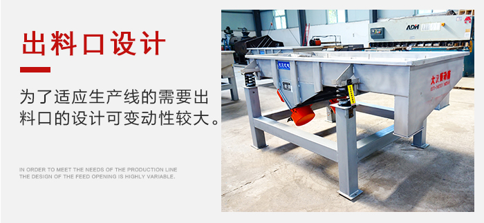 (2)多層直線振動篩出料口的設(shè)計可變動性較大,一切為了適應(yīng)生產(chǎn)線的需要。例如多層直線振動篩的出料口的形狀有圓形的、方形的;出料口的伸縮方向可以設(shè)計成向前伸、向下伸、傾斜向下伸等。
