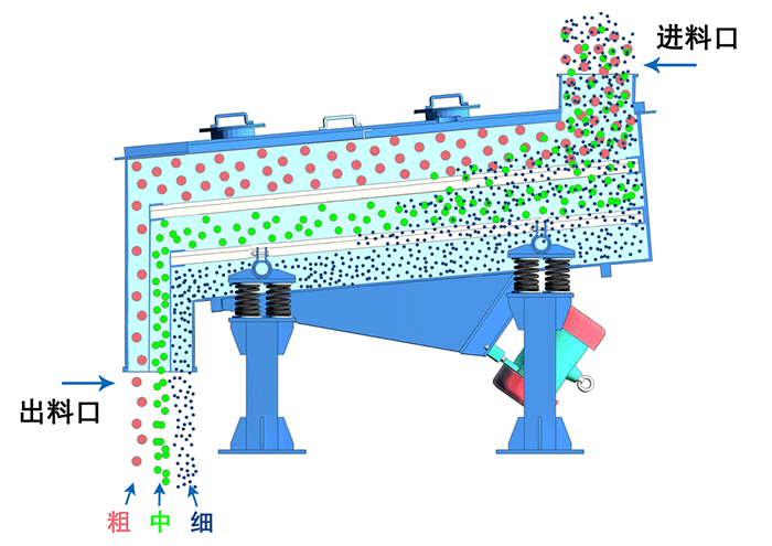 直線篩依靠兩個(gè)相同頻率的反向電機(jī)使物料在篩面上直線向前跳躍,小于篩孔孔徑的物料通過篩網(wǎng)落入下層,將原本雜亂無章的顆粒分離,即按粒度分層,形成底部小顆粒、頂部粗顆粒的排列,從而達(dá)到對(duì)物料進(jìn)行篩分和分級(jí)的目的