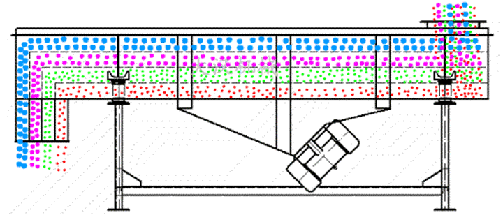 粉煤灰振動利用振動電機(jī)激振作為振動的振動來源,使物料在篩網(wǎng)拋起,同時向前作直線運(yùn)動,物料從給料均勻地進(jìn)入振動篩機(jī)的進(jìn)料口,通過多層篩網(wǎng)網(wǎng)孔大小的不同控制物料顆粒的大小,從而保證不同的物料在不同層級中被排出篩箱外。