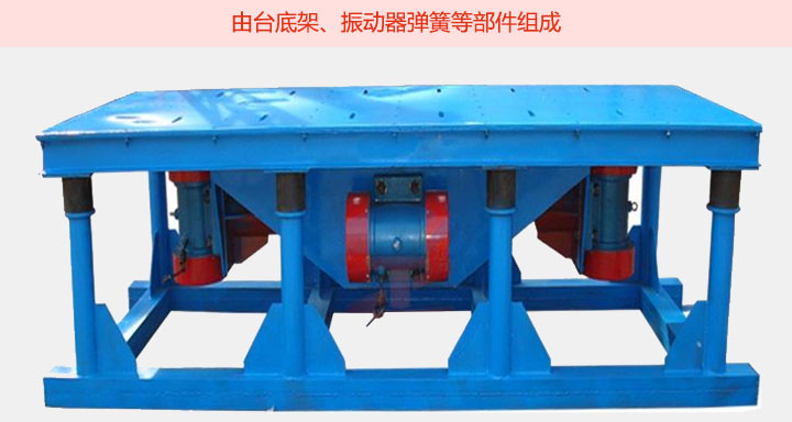 混凝土振動臺主要由臺底架、振動器彈簧等部件組成,臺面與底架均用鋼板和型鋼焊接而成,振動臺是用電動機 加一對相同的偏心輪組成。并通過一對吊架聯(lián)軸器安裝在臺面(反面)中心位置,起著振實過程中平穩(wěn)、垂直方向的作用。