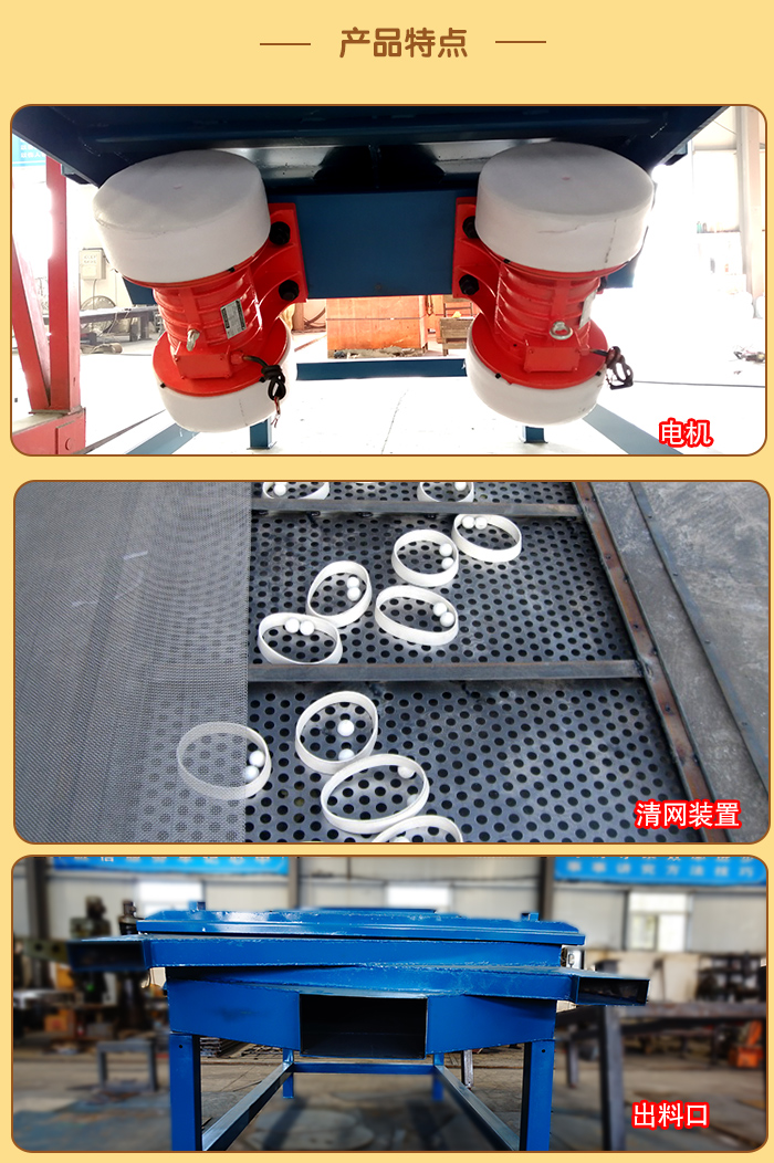 6、設(shè)備在停機(jī)時產(chǎn)生瞬間的共振區(qū),此時振幅和噪聲會明顯增大,屬正?,F(xiàn)象,設(shè)備在開停機(jī)前,篩面上不得有存留物料,篩網(wǎng)需經(jīng)常檢查是否張緊、破損,如有破損要即時更換。